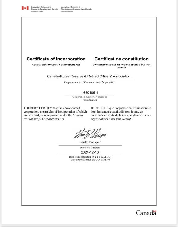 대한민국 예비역장교연합회 캐나다지구회 비영리법인단체 캐나다 연방정부인증서